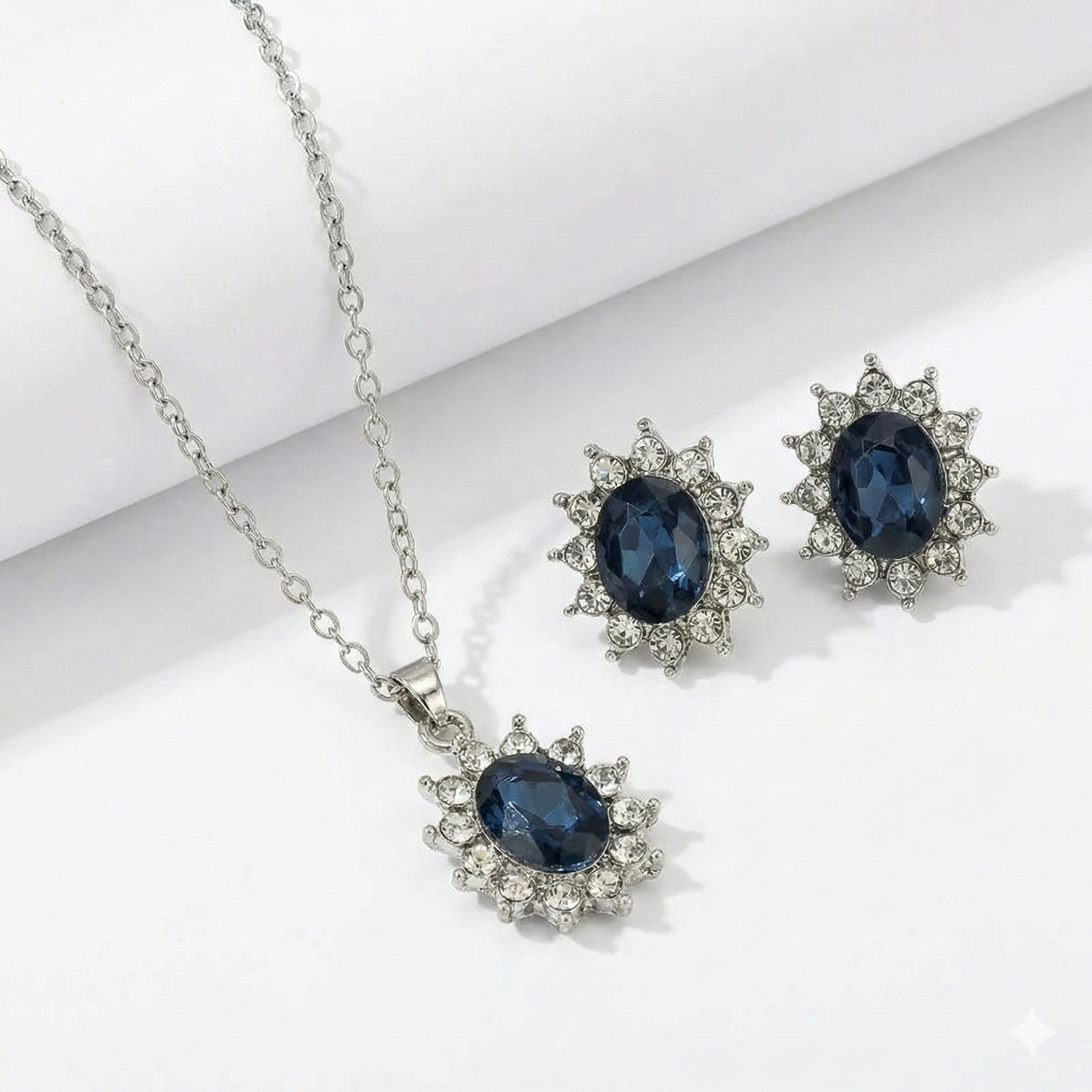 The Katya Azuryn set pairs a necklace and earrings, accented with vivid azure-blue stones. Elegant and timeless, it captures the beauty of the sea in every detail.
